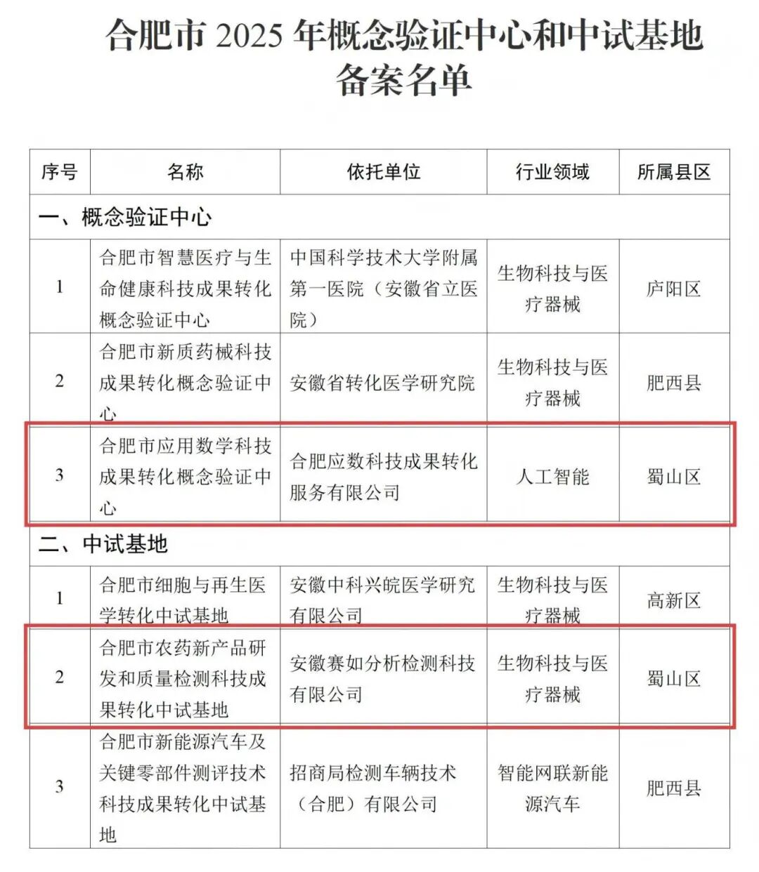 近日,合肥市2025年科技成果转化概念验证中心和中试基地备案名单正式公布,蜀山区斩获两项重要成果——合肥应用科技成果转化服务有限公司、安徽赛如分析检测科技有限公司分别成功获评市级概念验证中心和中试基地,为区域科技成果从实验室走向产业市场再添强劲引擎。