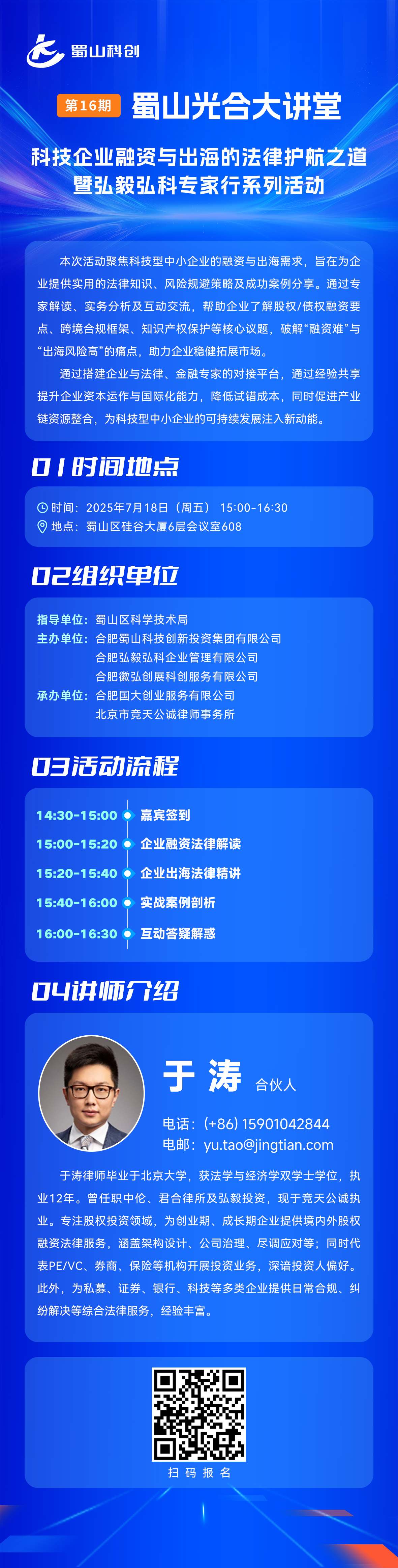 7月18日,“第16期蜀山光合大讲堂”科技企业融资与出海的法律护航之道暨弘毅弘科专家行系列活动将在“科大硅谷”蜀山园硅谷大厦举办。