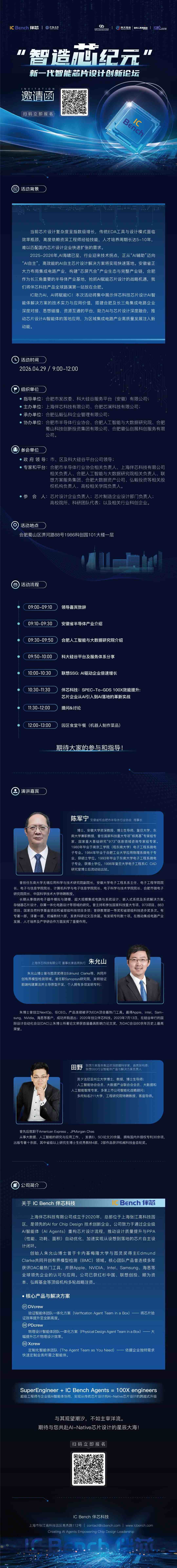 本次论坛将于2026年4月29日(星期三)9:00在科里科气1986科创园举行。论坛将重点介绍安徽省集成电路产业生态布局、合肥人工智能与大数据研究院科研成果与产学研合作方向、伴芯科技SPEC-To-GDS芯片设计AI智能体解决方案的技术优势与落地价值、科大硅谷产业服务体系与企业扶持政策、联想AI驱动产业增长的实践路径等相关情况。届时合肥市、区政府领导,安徽省半导体行业协会、科大硅谷服务平台、合肥人工智能与大数据研究院、联想方案服务集团、上海伴芯科技、弘毅投资、合肥市半导体行业协会的专家和行业资深人士,以及芯片设计、制造企业代表与高校院所科研团队,将共同围绕AI赋能芯片设计的技术落地、集成电路产业资源互通、芯片设计AI智能体场景应用等内容深入研讨交流,共同擘画“AI+IC”融合发展的长三角集成电路产业新图景。