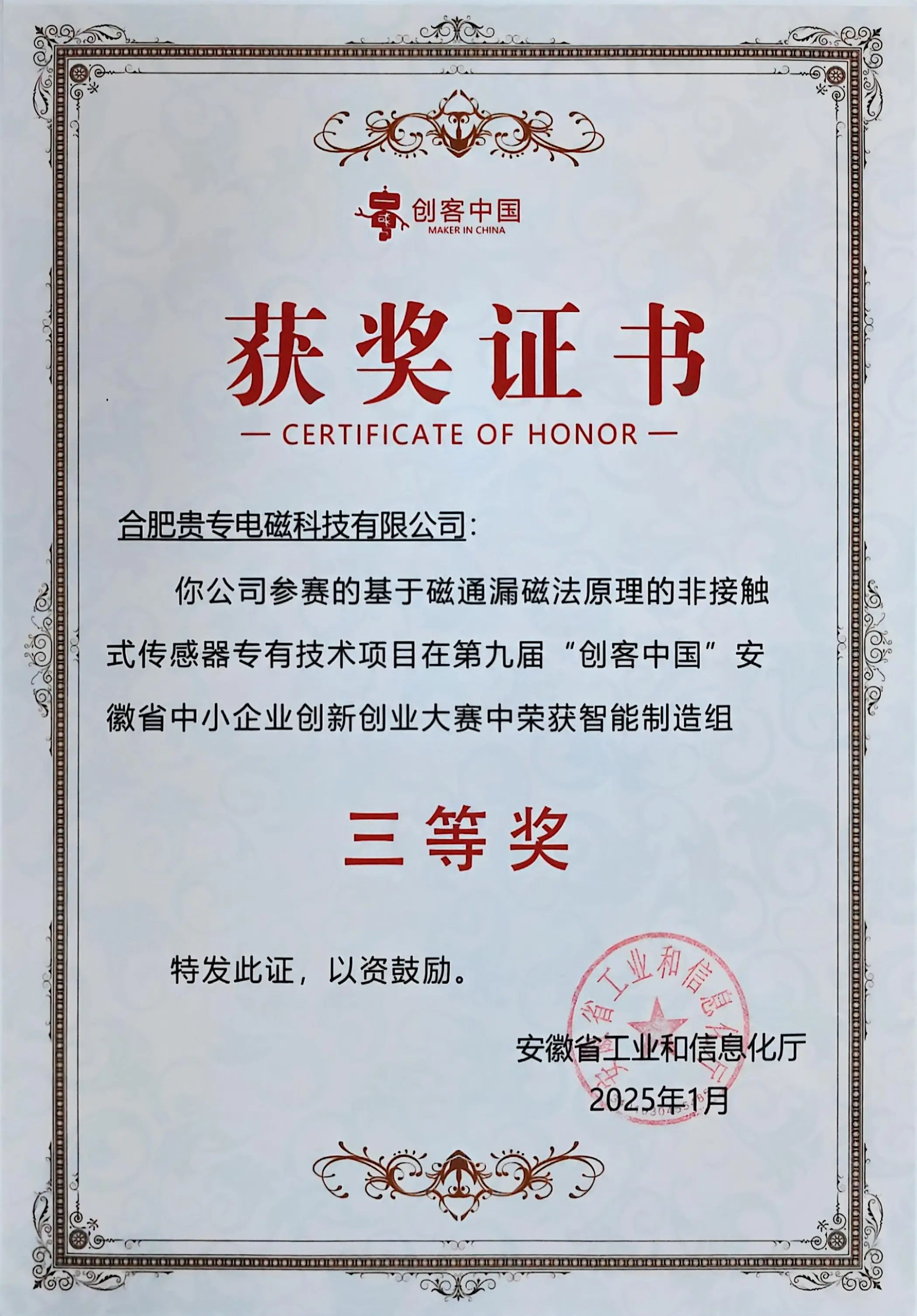 “创客中国”安徽省中小企业创新创业大赛作为省内最具影响力的创新创业赛事之一,是全国大赛的重要组成部分,为中小企业和创客提供交流展示、项目孵化、产融对接、协同创新的平台。据了解,第九届“创客中国”安徽大赛共征集项目1805个,其中企业组1036个,创客组769个。在被公认为“竞争最激烈”组别的智能制造组中,参赛单位多为实力雄厚的中央企业、国有企业以及行业领先的大型民营企业,强手如林。凭借卓越的创新项目和过硬实力,中科贵专经初赛、复赛和决赛三个环节,在激烈角逐中脱颖而出,携“基于磁通漏磁法原理的非接触式传感器专有技术项目”荣膺大赛智能制造组三等奖,充分展现了公司在智能制造领域的创新活力与技术优势。
