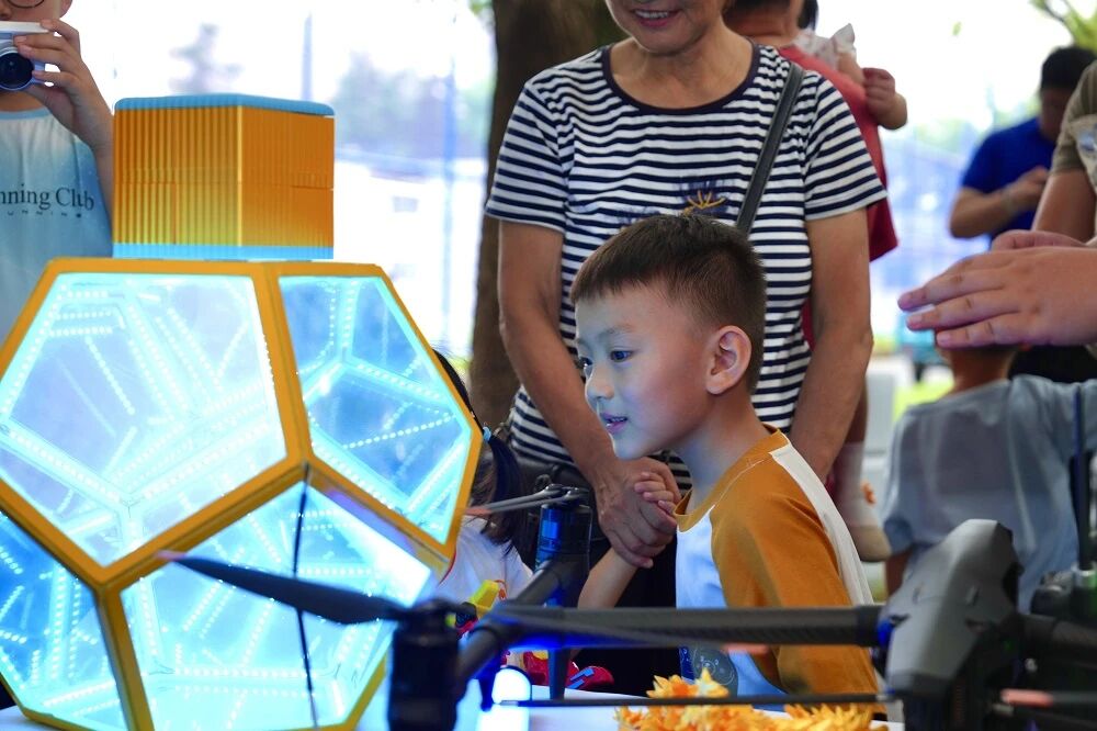 在科技互动展区,家长带着孩子参观体验科技产品。