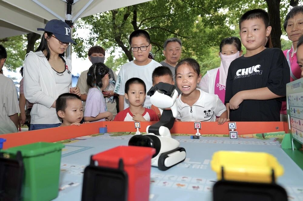 “智趣机器人乐园”成为孩子们流连忘返的天地。编程机器人在指令下精准完成抓取、避障等动作,AI机器人“果小聪”则化身科普教员,通过编程互动教会小朋友完成垃圾分类与防震演练。