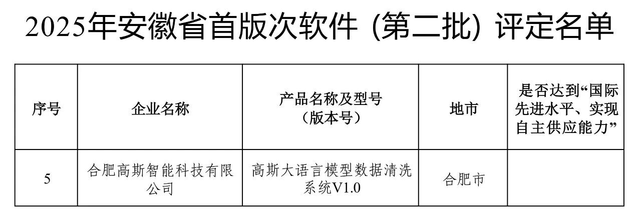 合肥高斯智能科技有限公司是合肥人工智能与大数据研究院首批孵化的智能制造软件领域科技型企业,由中国科学技术大学博士团队创立。公司依托数学、计算机、自动化等多学科交叉研究优势,聚焦于高端智能制造领域,为流程型工业制造业提供全栈式解决方案。此次入选的高斯大语言模型数据清洗系统V1.0,凭借自主创新算法,可实现海量数据的高效筛选与优化,为人工智能模型训练提供高质量数据保障。